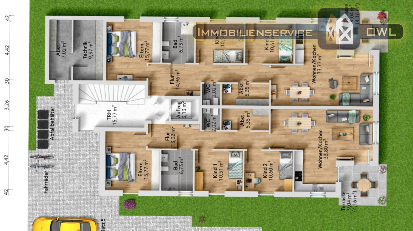 - Erdgeschosswohnungen mit weitläufigen Terrassen und privaten Gartenanteilen